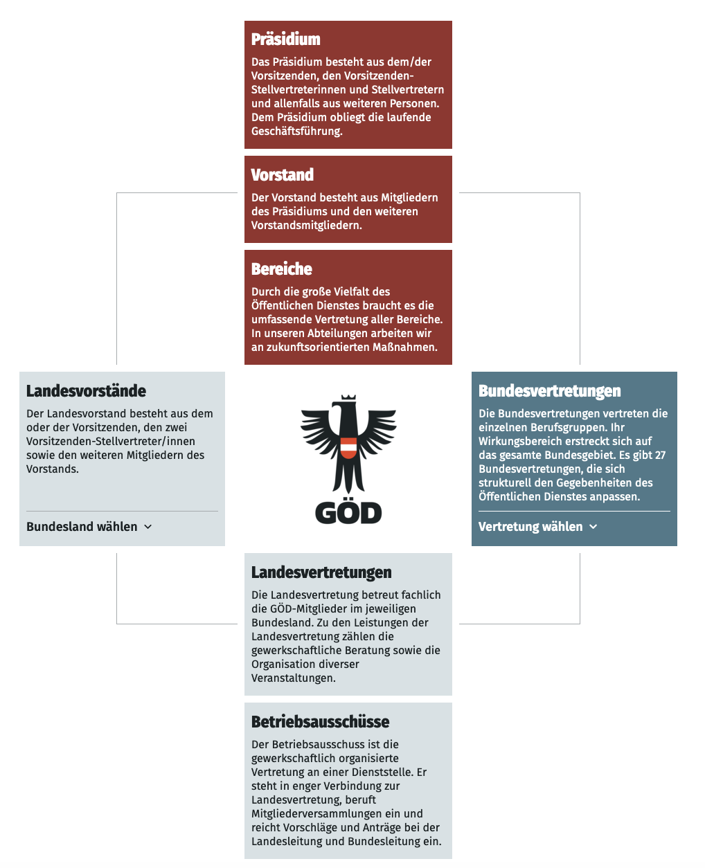 Es ist der Einsatz aller GÖD-Mitarbeiterinnen und -Mitarbeiter sowie Funktionärinnen und Funktionäre, die unseren erfolgreichen Weg ermöglichen. Dabei sind es der Gestaltungswille und die persönliche Leidenschaft unseres GÖD-Teams, die uns zur stärksten Kraft machen – und wir haben noch viel vor. Hier kannst du einen Überblick über Aufbau und Struktur der GÖD gewinnen.